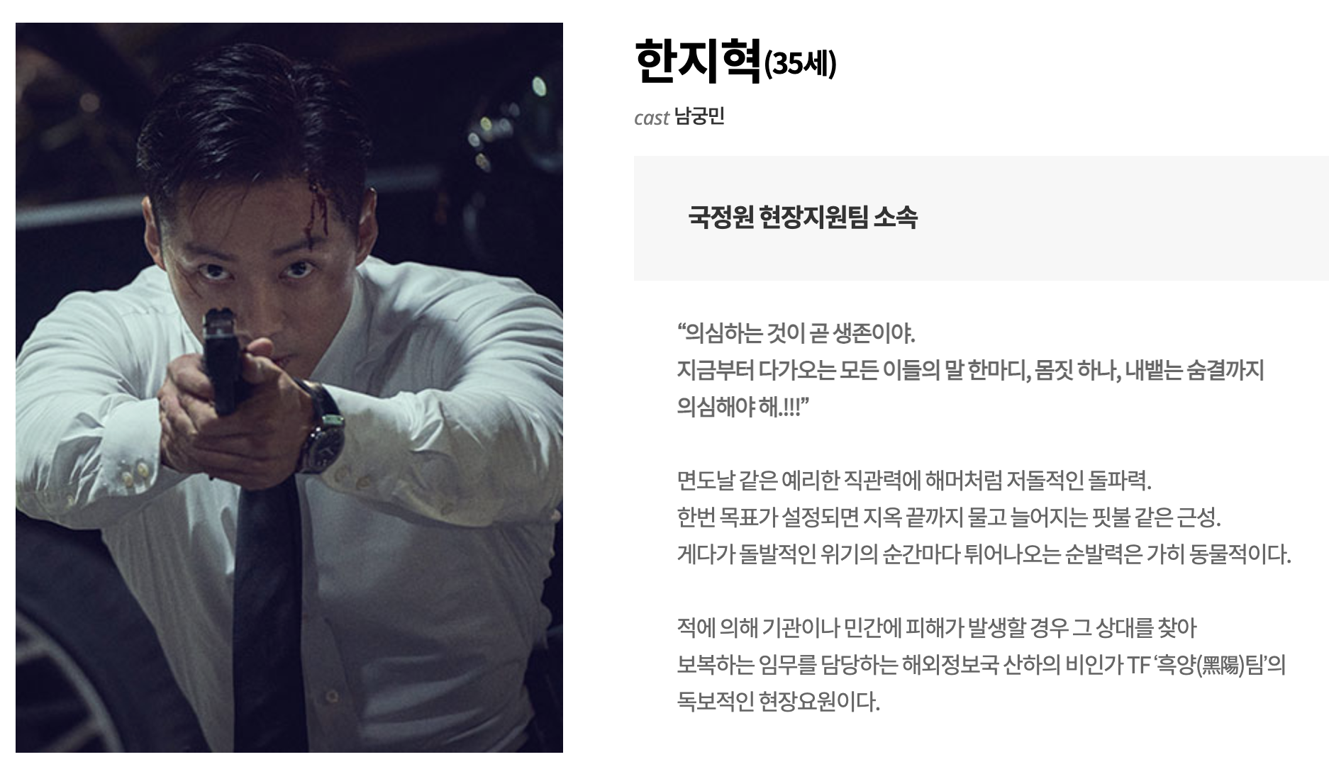 주인공 한지혁 (남궁민) / 국정원 현장지원팀 소속